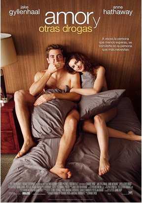 El actor masculino de Amor y otras drogas es el guapo Jake Gyllenhaal. Esta película describe la historia entre una chica joven enferma de parkinson que siempre ha evitado el compromiso y un representante farmacéutico obsesionado por el sexo.